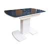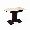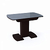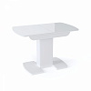 Недорогая функциональная и стильная модель.  Каркас стола изготовлен из ЛДСП, цвет белый или венге. Столешница из МДФ с закаленным стеклом, матовым или глянцевым на выбор. Имеет полуовальную форму, размер 110 см с возможностью увеличения еще на 30 см. Опирается на одну ножку, переходящую в две плоские опоры на полу.