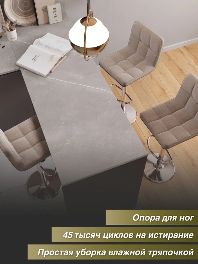 Толщина наполнения делает этот барный стул удобным для человека практически любой комплекции. Но главная изюминка стула - это обивка из мебельного премиум-велюра. Износостойкий (45 тысяч циклов по Мартиндейлу на износ), бархатный и приятный на ощупь, он разительно контрастирует с искусственной кожей, которая так популярна в барных стульях. При этом в практичности наш велюр не уступает экокоже. Любое загрязнение легко очищается влажной тряпочкой в мыльном растворе.